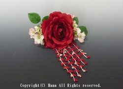 シルクフラワーのバラとちりめんの下がりのコラボ作品です。大輪の赤いバラとピンクのプリムローズを組み合わせ、アクセントに葉をプラスいたしました。和の雰囲気たっぷりのちりめんの下がりは取り外し可能。下がりつきでお着物に、下がりを外してドレスにと...