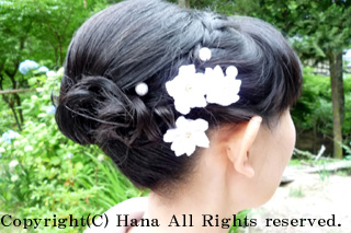 サイドと後ろに自作の花のUピンと、パールのUピンを挿していただきました。